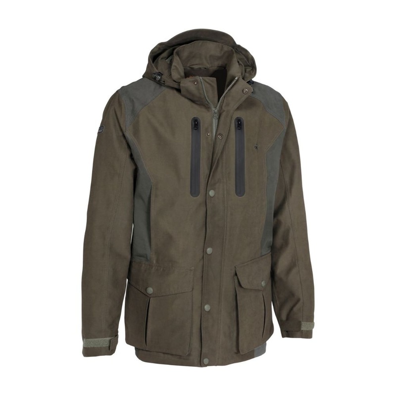 Silent, flexible and comfortable jacket. Waterproof and breathable membrane. Taped seams. Ventilation system with zipper under the arms. Adjustable and removable storm hood. Two chest pockets with waterproof zipper. Handwarmer pockets. Two large gusseted lower pockets with two rows of integrated cartridge straps and attachment strips. Three zippered pockets. One cell phone pocket. One tag pocket, adjustable cuffs. Zippered hunting pocket, removable on three sides.