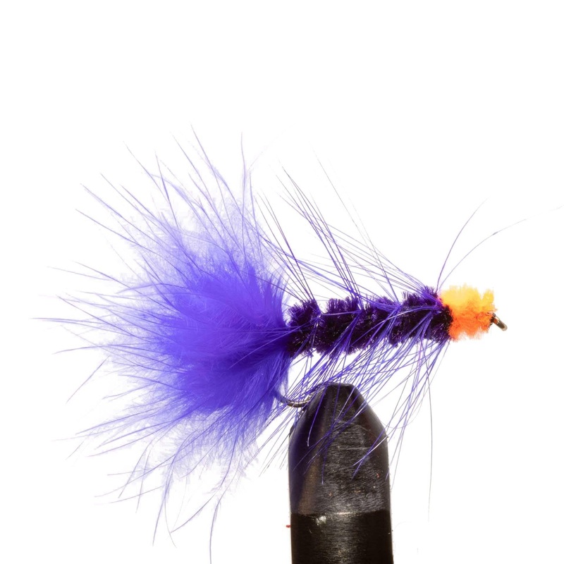 The Purple Egg-Sucking Leech - Orange Egg is a powerful and visually striking fly pattern designed to target steelhead, trout, and salmon. This combination of a dark purple leech body and a bright orange egg is highly effective, particularly during spawnin