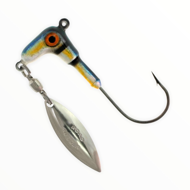 The Swim-N-Runner heads have sound, flash, vibration and contrast that makes any swim bait better! Featuring Natural Science finish, 3-d eyes, Scaled Pattern, 4/0 Daiichi Hook, ball bearing swivel and nickel over brass willow blade.