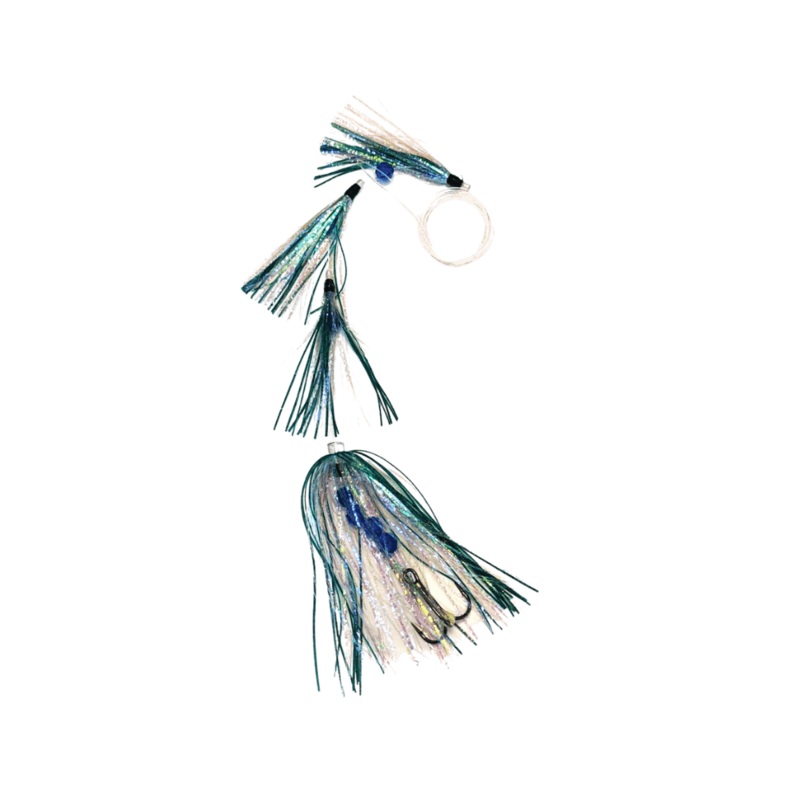 Salmon Candy’s Vegan Rigs are a great option to go meatless in you fishing spread! These rigs are, ade with 50# fluorocarbon and a quality hook each rig has 3 teaser flies and one main fly!