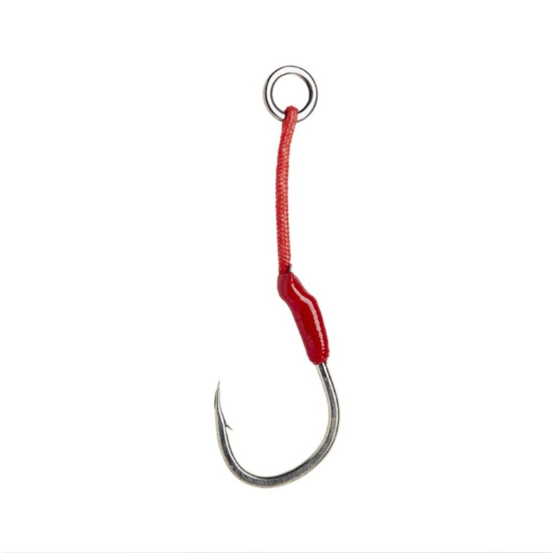 Our new Bloody assist hook range contains some serious tools to help you land your dream fish. The hooks used in our J range are forged from incredibly tough yet lightweight Japanese carbon steel and feature an aggressive angle and razor-sharp point that consists of two cutting edges that meet. As a result, this hook can easily penetrate scales, bones and jaws even from heavily armoured fish like snappers. The blade point also has a long-lasting life so you can use it to catch fish after fish. We supply the Bloody assist J hooks in single or double versions, with both featuring wrapping along the shank to eliminate jig scratching and improve hook position, strength and setting. The high quality cord has a fluorocarbon core in order to stay straight and ready for hooking. Bloody assist J hooks are ideal for all jigging, light jigging, shore jigging and cast jigging techniques.