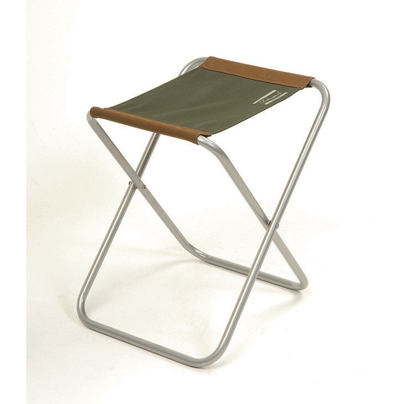 A robust must have folding stool in green and tan with a silver frame. Incredibly lightweight and portable.