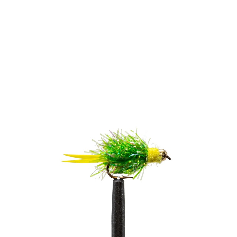 The Sparkle Rock Roller is a flashy nymph pattern that imitates a free flowing caddis larva. This unique fly pattern combines the appeal of a classic rock roller with a touch of sparkle made of Estaz, making it an irresistible choice for trout and other species.