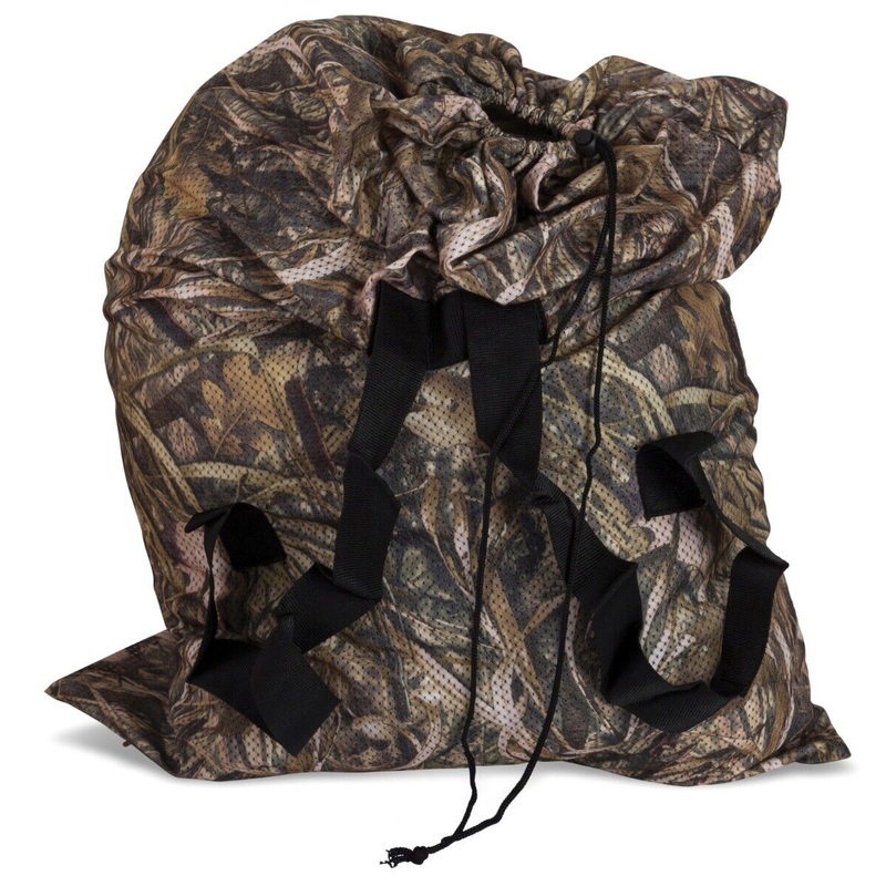 Extra large decoy bag made in camo mesh for transporting decoys, hide nets etc. Features shoulder straps and draw cord top closure.