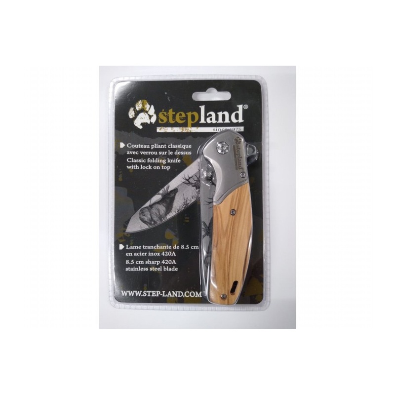 Thisdeer engraved folding knifeis a creation of theSteplandbrand .Equipped with awooden handle, it stands out with its blade on which adeeris drawn .The blade isstainless steel.