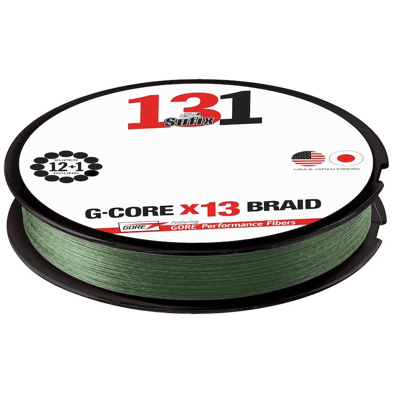 Sufix G-CORE X131 BraidDelivering a new level of smoothness, the Sufix 131 G-Core Braided Line is built with 13 fibers (12HMPE Fibers + 1 GORE Performance Fiber in the core) to guarantee consistently strong construction with no weak points for reliable per