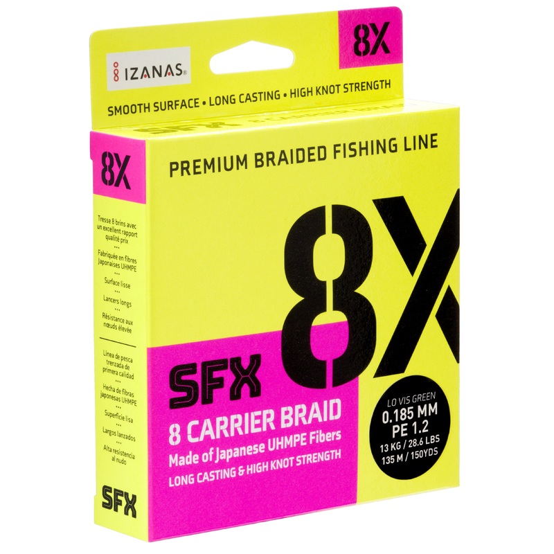 Sufix SFX 8X Braid 275m Hot YellowThis Sufix SFX 8 Carrier Braid is an eight carrier premium braided fishing line made with 100% Japanese UHMPE fibres for smooth surface that results in long casts and quiet performance through the guides.High knot strength