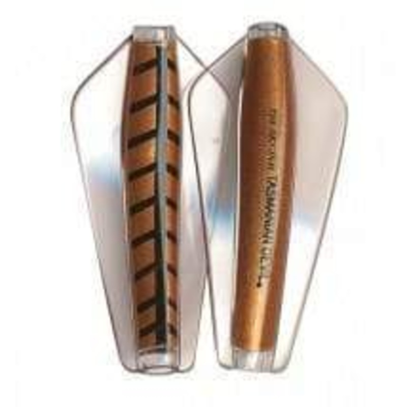 The Tasmanian Devil or “Tassie Devil” as it is more affectionately known, was born in 1979The Lure consists of a hollow weighted, torpedo shaped central core surrounded with plastic including curved wings out each side. A wire loop with hook coupled is fitted through the core.Various patterns, colours and designs are painted on the exterior.Please be aware that the range of Tasmanian Devil lures are currently going through a change in specification.The previous versions were fitted with a wire mount and treble mounted through the core of the lure.The latest versions now feature a line through style system. Included in the pack is a bead and hook allowing the user a more flexible range of mounting options.
