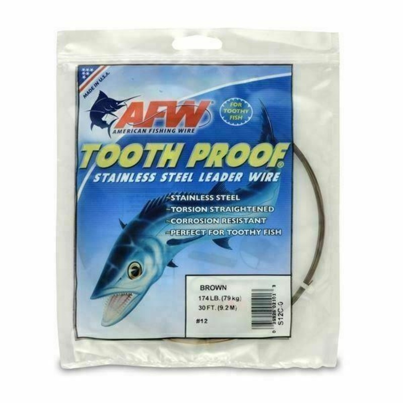 Tooth Proof possesses incomparable abrasion resistance and tames the toughest toothy fish. AFWs unique pre-straightening process eliminates cast, providing a straighter leader wire with improved kink resistance. Special Camouflaged Brown finish vanishes in deep water. Tournament tested tough, this proven leader wire continues to put anglers on the winner board! Made in USA by AFW.