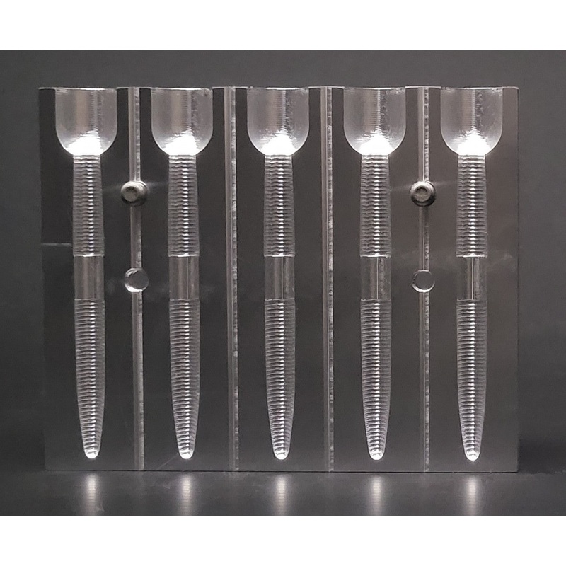 Top Pour 3.2″ Old Skool Stick Bait, it is .33″ at its fatest point. 5 cavity top pour. Mold is a top port two piece mold. Injection is possible with the mold, but mold is designed for hand pours.