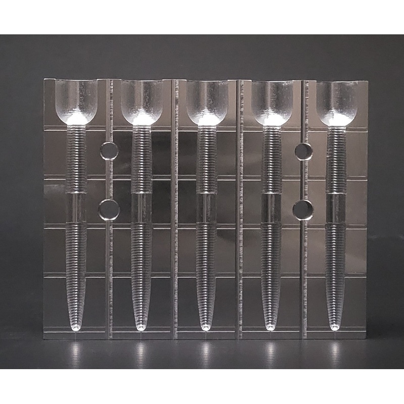 Top Pour 4.2″ Old Skool Stick Bait, it is .38″ at its fatest point. 5 cavity top pour. Mold is a top port two piece mold. Injection is possible with the mold, but mold is designed for hand pours.