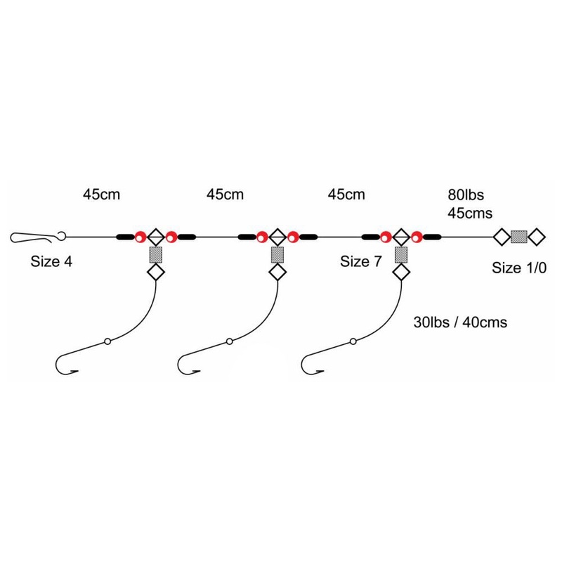 A fantastic, all round rig that will catch a wide variety of species. The rig to go for when putting down a large scent trail and trying to catch a quantity of fish or when species hunting and wanting to try different baits and bait combinations. A great rig when match fishing for quantities of whiting, pouting, coalfish, pollack, codling and dabs. Not the best rig for range, but excellent at close to medium range. When fished in its flapper form, this rig is also excellent from a boat. The rig is available as either a flapper or as a clipped down rig for casting distance. The clipped down version comes with a rig spring below the top hook snood to eliminate hook length stretch and to keep snoods tight.