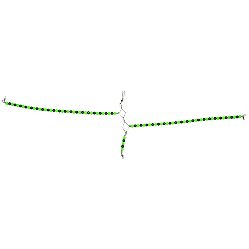 A boat boom that is suited to targeting bottom-dwelling fish. Designed to be used predominantly when drift fishing from a boat, the two booms keep two hook snoods away from each other and fishing in a straight line either side of the weight. The series of green and black beads add visual attraction, which is essential when targeting inquisitive flatfish such as plaice. Two small swivels on either end of the booms are ideal for clipping on hook lengths, giving the angler the option to quickly change snoods as they see fit depending on the situation. These spreaders are fantastic when fishing for plaice, in conjunction with snoods that have been dressed in beads and blades. Spreaders are also useful when targeting smaller species with finer snoods and hooks, such as dragonets.
