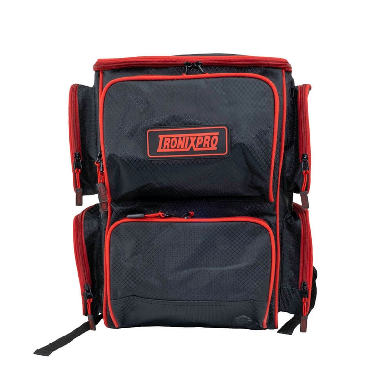 Four, large pannier pockets, two on each side of the rucksack stand off the main compartment, so they can be filled with items without taking away storage from the main compartment. These pockets are ideal for close to hand items such as tools, rigs, terminal tackle and are strong enough to carry leads in too. On the front of the rucksack, two, stand-off pockets run the whole width of the main compartment and are large enough for storing rig wallets, tackle boxes and other larger tackle items. Each pocket is double zipped for convenience and comes with red pull cords, and rubberised Tronixpro branded tabs for ease of use with cold or wet hands. A grab handle on the back makes it easy to lift the rucksack.
