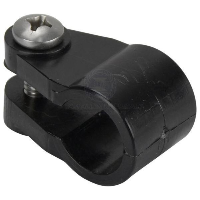 Chandlery Product Plastic molded clamp. Stainless steel fasteners. SPECIFICATIONS (Click Part No. for More Details) Part No. 25115 Color Black Gap Width 7mm Suits Tube O.D. 25mm Plastic molded clamp Stainless steel fasteners