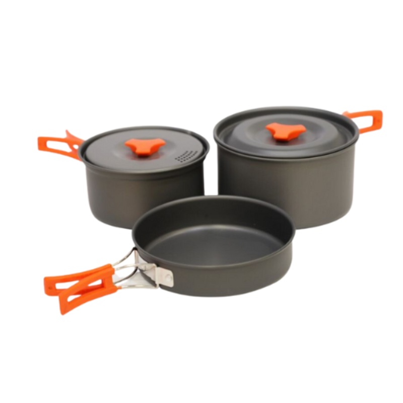 Everything you need to make quick and easy meals on the go for up to 2 people. This Hard Anodised Cook Kit is perfect for making meals in the great outdoors and is ideal for camping and campervanning with its durable, hard anodised construction. The set includes 2 lightweight, non-stick pots and a non-stick pan with comfortable, heat resistant handles. The whole kit packs down and stacks inside itself for easy transportation and includes a soft carry bag for storage.