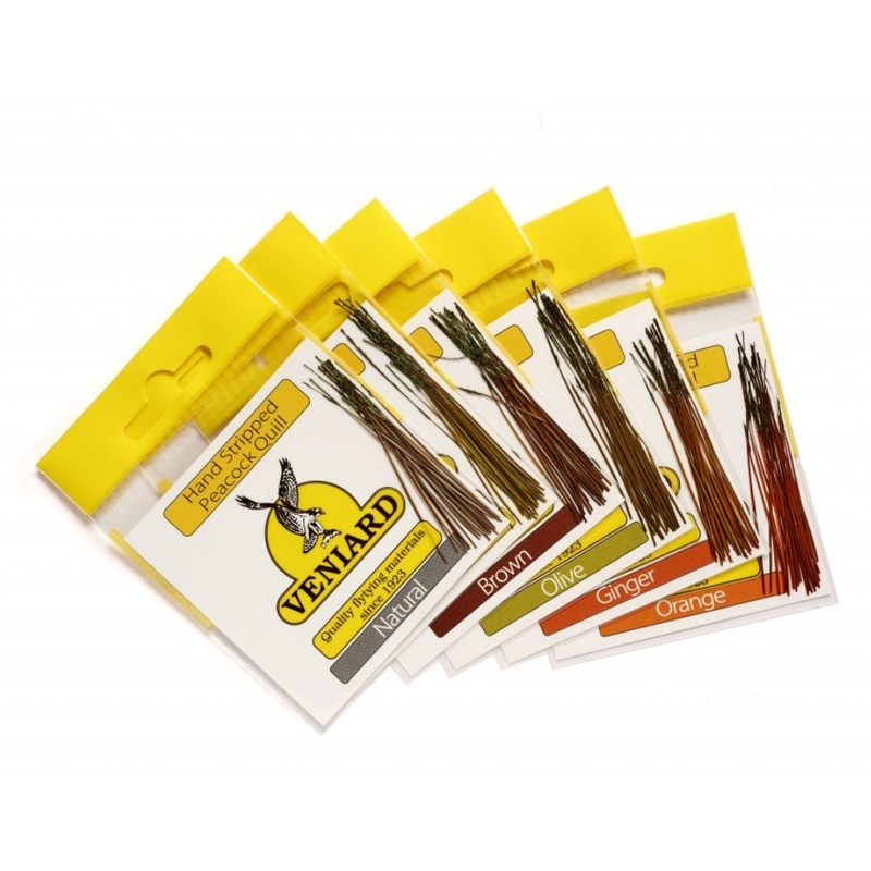 Veniard Hand Stripped Peacock Quills (25pcs/package). Take the pain, and inconsistency, out of stripping and dying peacock quills: we supply ready to use peacock eye quills dyed in a range of colours. This body material is used to create fantastic natural segmentation of flies tied on hooks from 12-22 dries, nymphs, spiders and buzzers.The quill comes from peacock eyes and is hand stripped, which eliminates the problems of cracking as when bleached or chemically stripped. When tying on smaller hooks, each quill can make up to three flies. We know that there is no better solution for creating segmented bodies of flies.