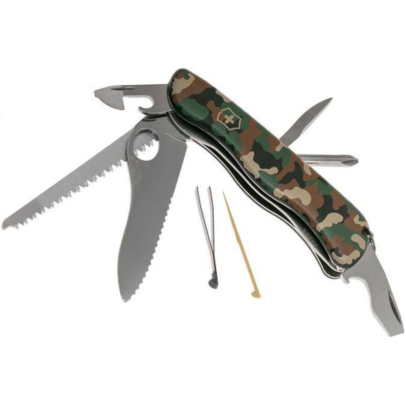 A pocket knife in the modern Military design about the size of 111 mm with lock of blade.Product detailed description 12 features:large closing knife with quick-opening eyelet with wavy bladecross screwdrivercan opener with a small screwdriverbottle opener