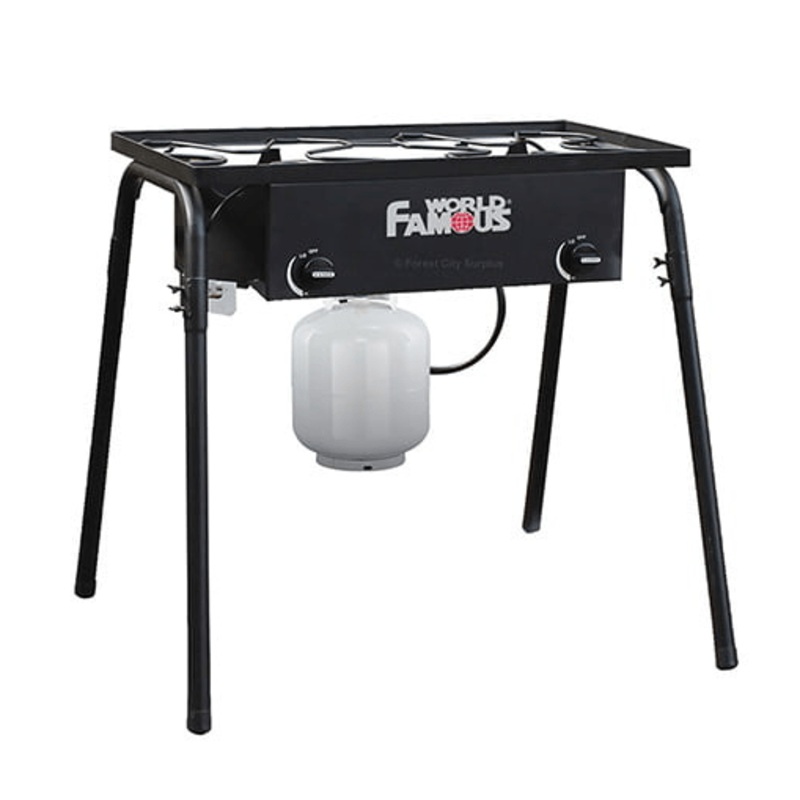 Ultra durable steel construction with dual high-pressure cast iron burners 2 x 40,000 BTU/burner total output Fully adjustable, separate heat control dials 20 PSI certified regulator with 1.2m tube Heat and weather resistant coating. Connects to standard 20lb refillable propane tank (not included) Legs are removable and stow for easy transportation / storage Adjustable legs to accommodate for uneven ground Ideal for home, camping, cookouts, tailgate, cottage and emergency preparedness
