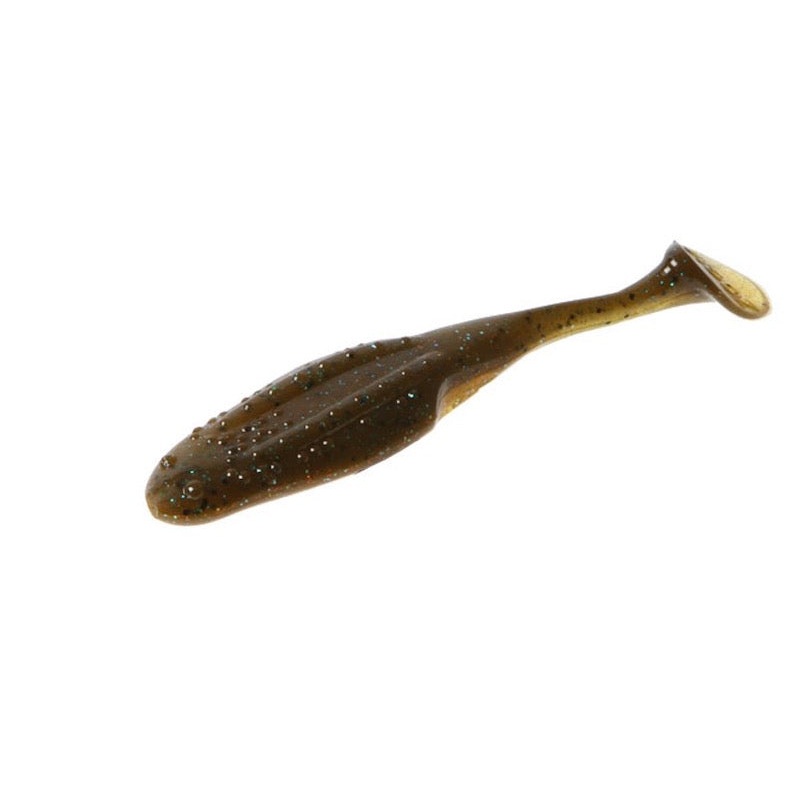 Has a single leg protruding from a flat toad-like body with a boot tail that creates a ruckus, along with ample plastic to keep the hook in place and weed free. It has a little of that Horny Toad sound, but its more of a sight thing. It rolls and swims with a little bit of body wobble. Just like the toads, its good over grass, but it also really looks like a blueback herring or a shad in open water.